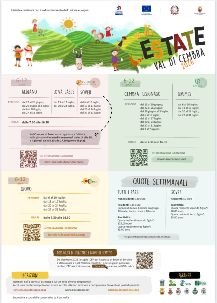 In allegato la locandina relativa alle attività estive 2026 in Valle di Cembra, rivolte a bambine e bambini dai 6 ai 12 anni e organizzate nei comuni di Albiano, Lona Lases, Sover, Cembra-Lisignago, Altavalle e Giovo, un’opportunità importante per le famiglie, che contribuisce in modo concreto a sostenere la conciliazione dei tempi di vita e di lavoro nel periodo estivo.
