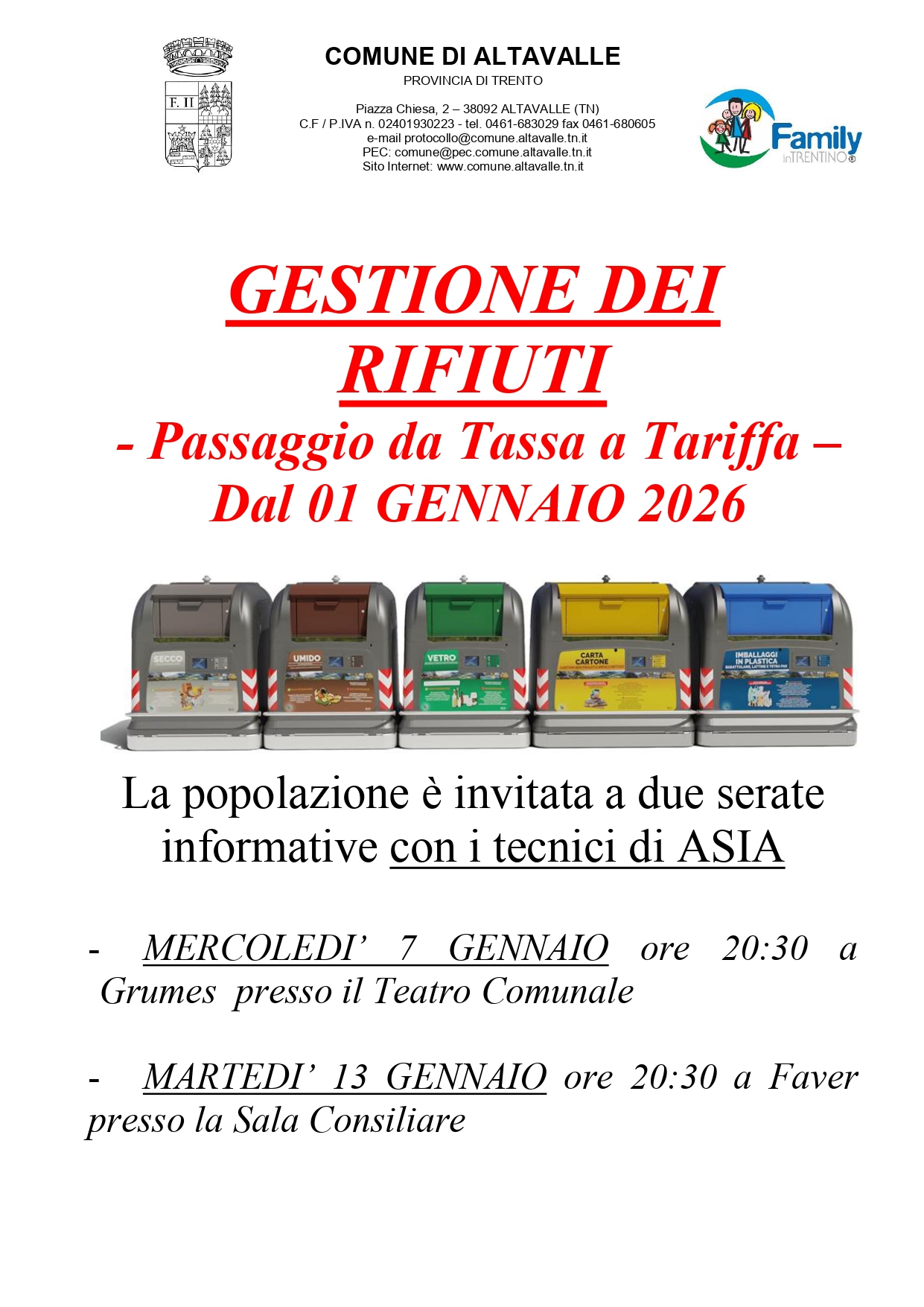 Cos'è La popolazione è invitata a due serate informative con i tecnici di ASIA:Mercoledì 07 gennaio 2026 ore 20.30 a Grumes presso il Teatro ComunaleMartedì 13 gennaio 2026 ore 20.30 a Faver presso la Sala Consiliare