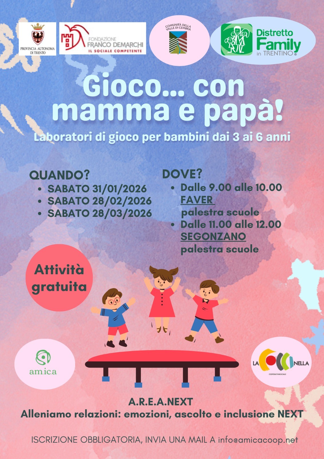 - Sabato 28/03/2026 dalle 09.00 alle 10.00 presso la palestra della Scuola di Faver (dalle 11.00 alle 12.00 presso la palestra della Scuola di Segonzano)