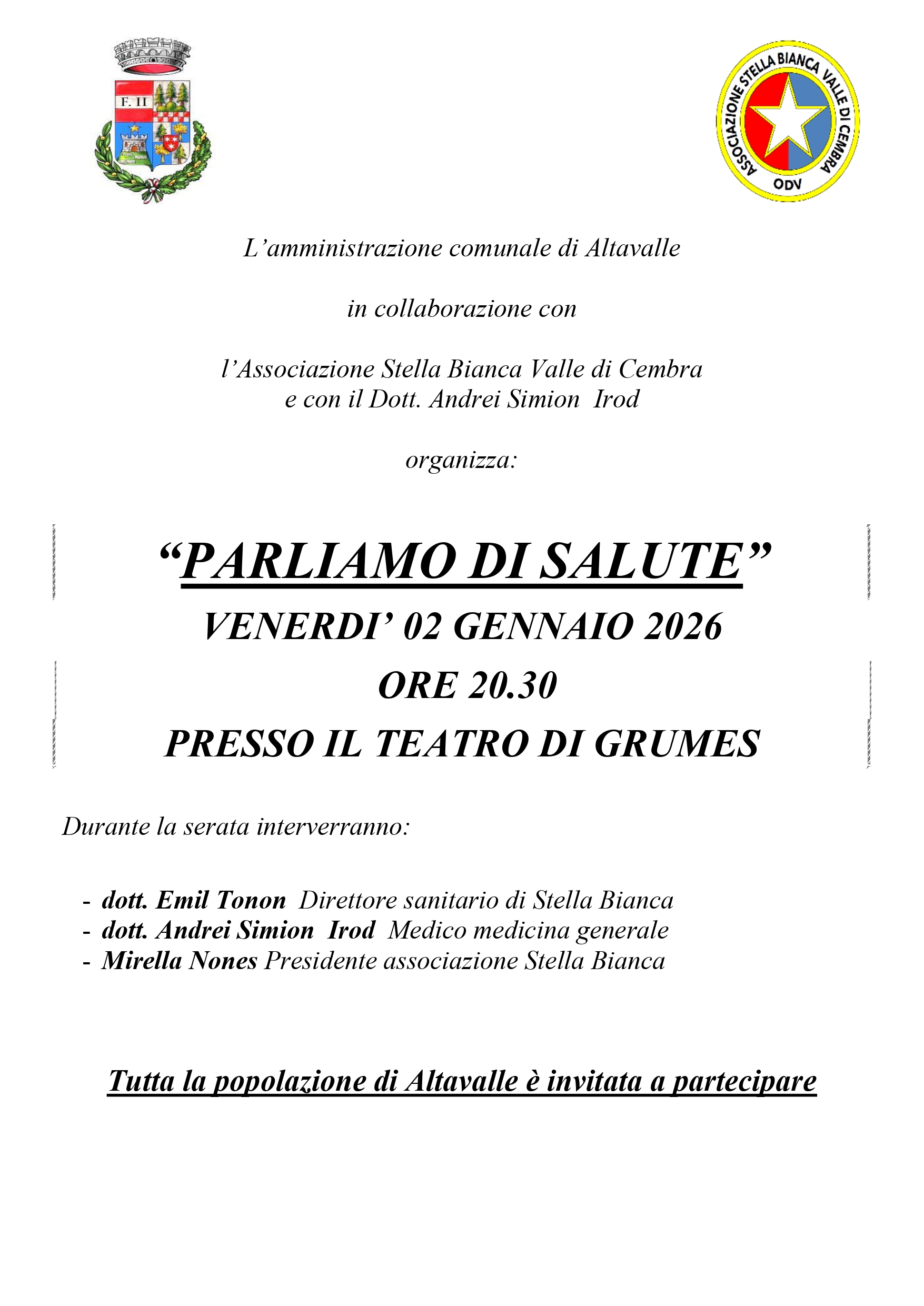 Evento organizzato dall'amministrazione comunale di Altavalle in collaborazione con l'Associazione Stella Bianca Valle di Cembra e con il Dott. Andrei Simion Irod.